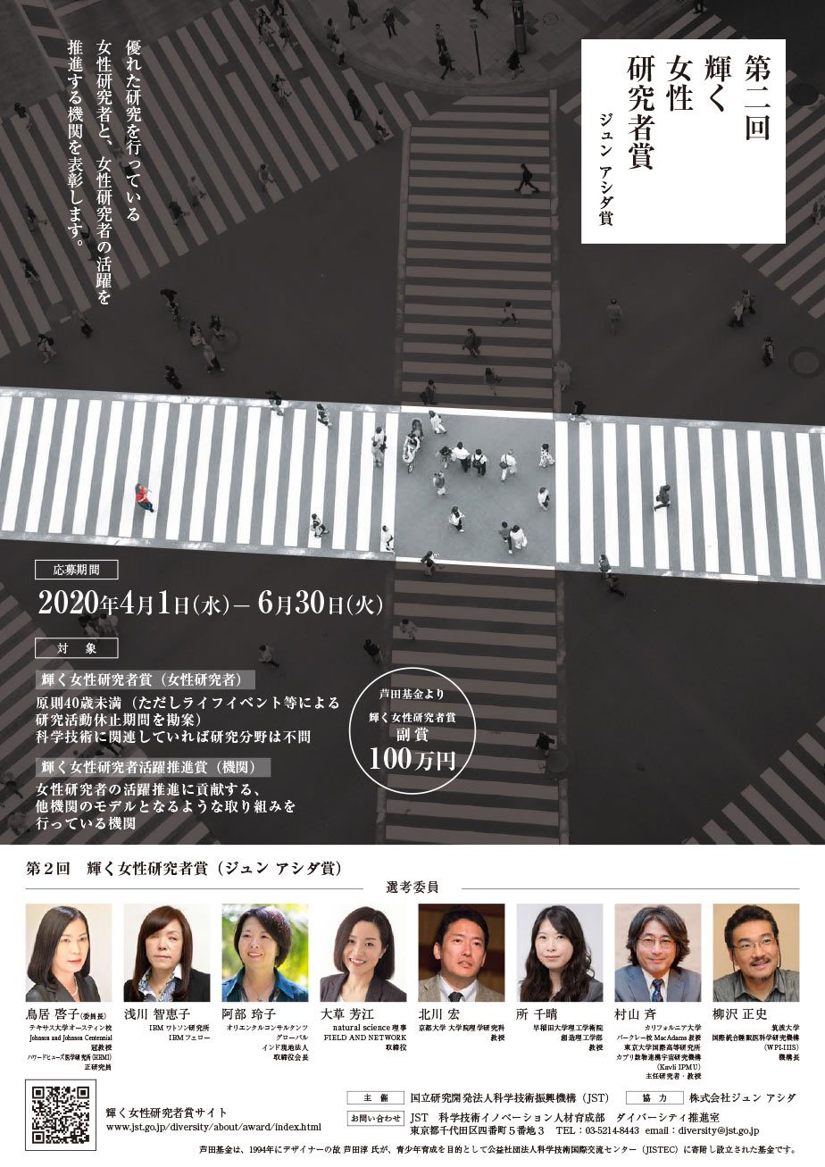 Japan Science and Technology Agency (JST) has started recruiting candidates and candidate institutions for the 2nd Brilliant Female Researchers Award (Jun Ashida Award) to support female researchers, who are engaged in excellent researches that contribute to a sustainable society and the future, and their activities.