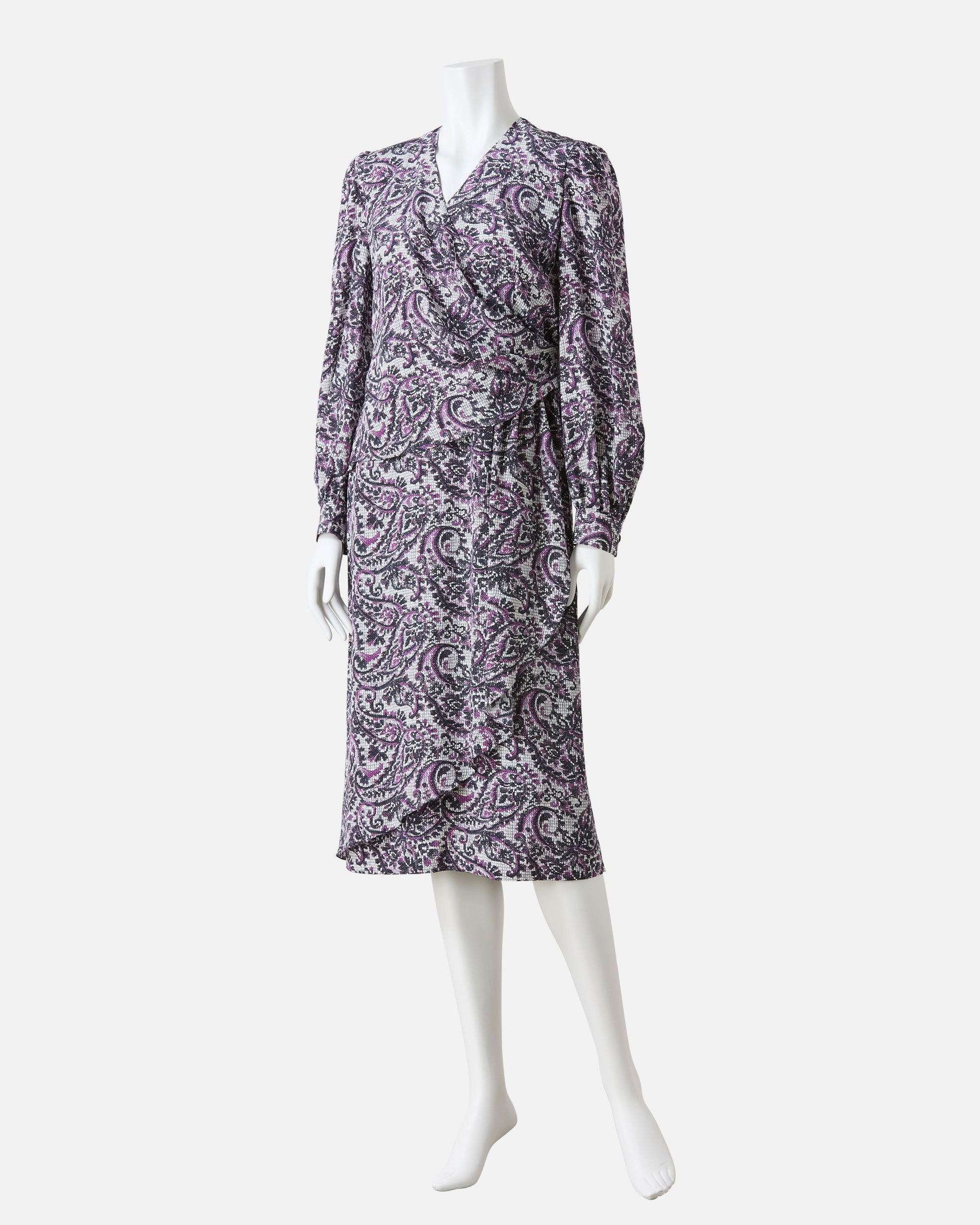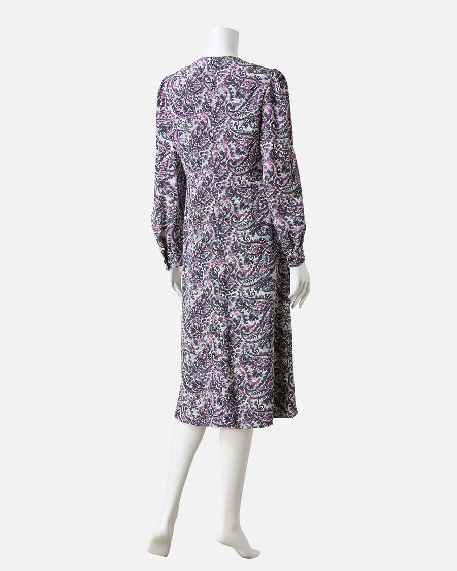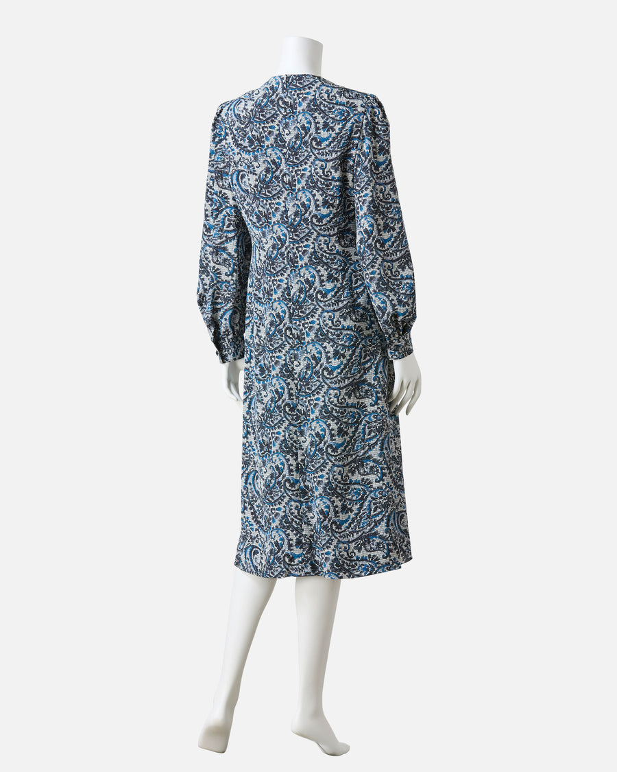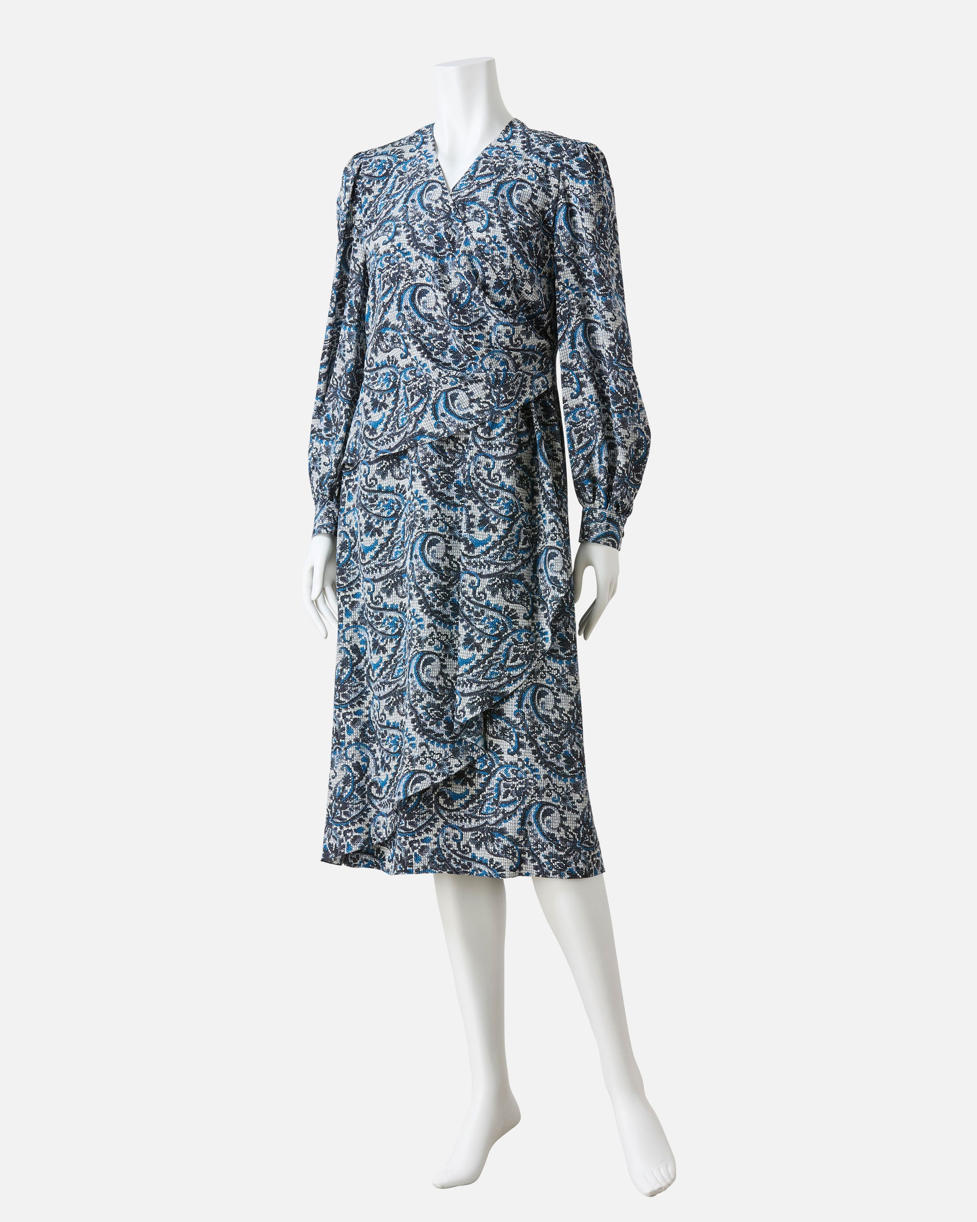 イタリア製シルクデシンに流れるようなペイズリー柄を配したプリントワンピース。クラシカルなモチーフをモダンにアレンジし、動きに合わせてニュアンスを生むドレープ使いが華やぎを添えて。日常のお出かけからちょっとしたカクテルまでどんなシーンにも着映えする、大人の気品と洗練された個性が印象的な一着です。