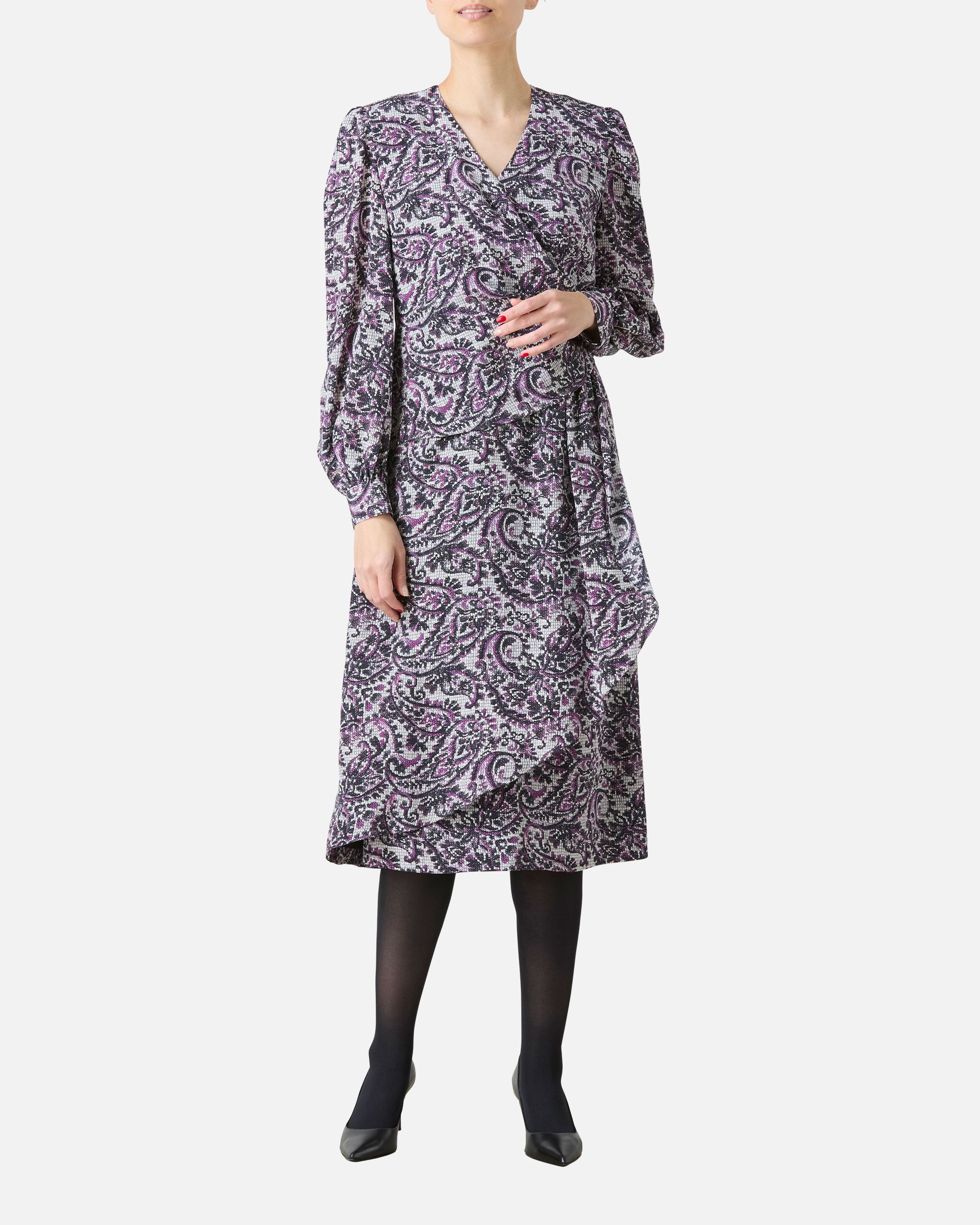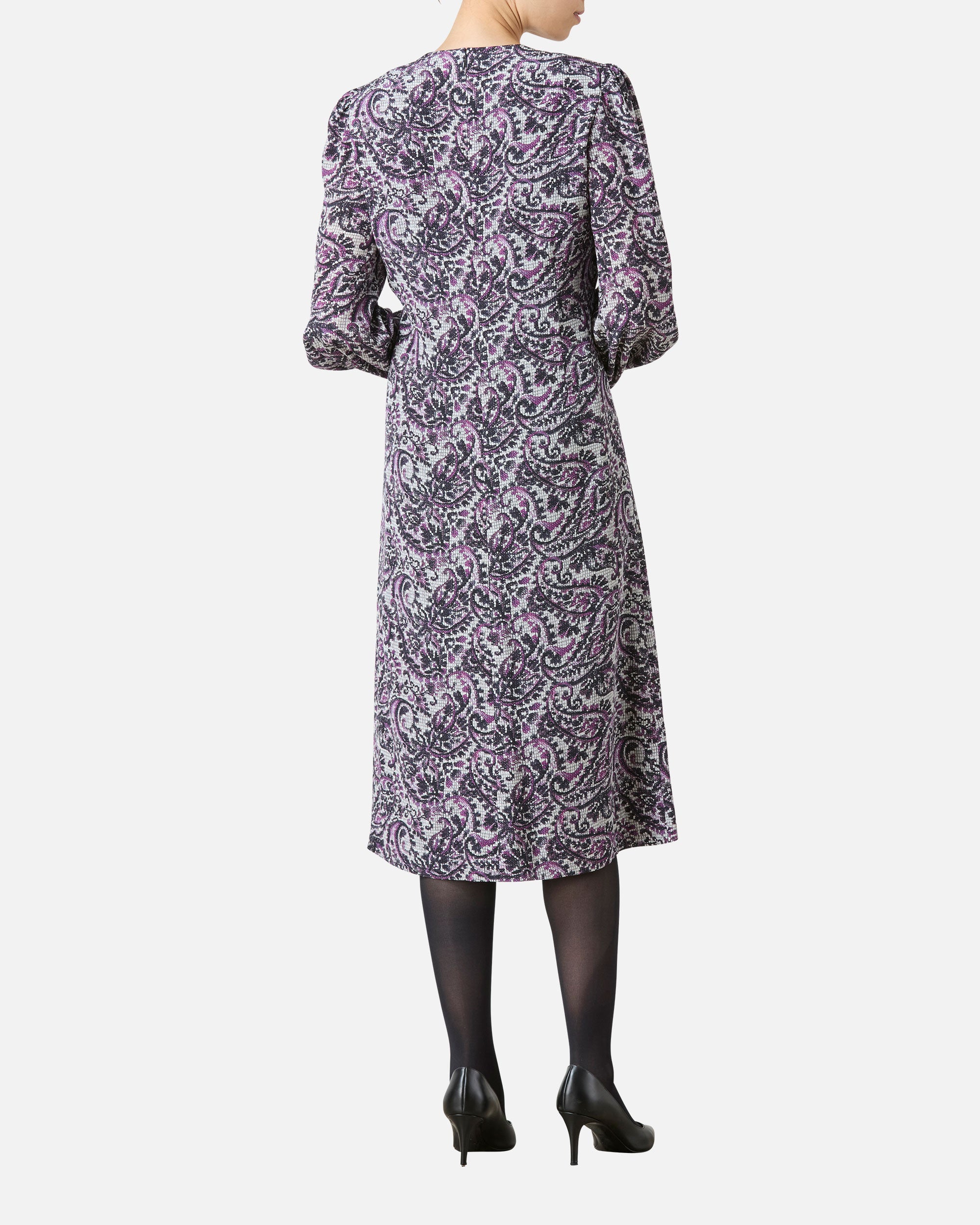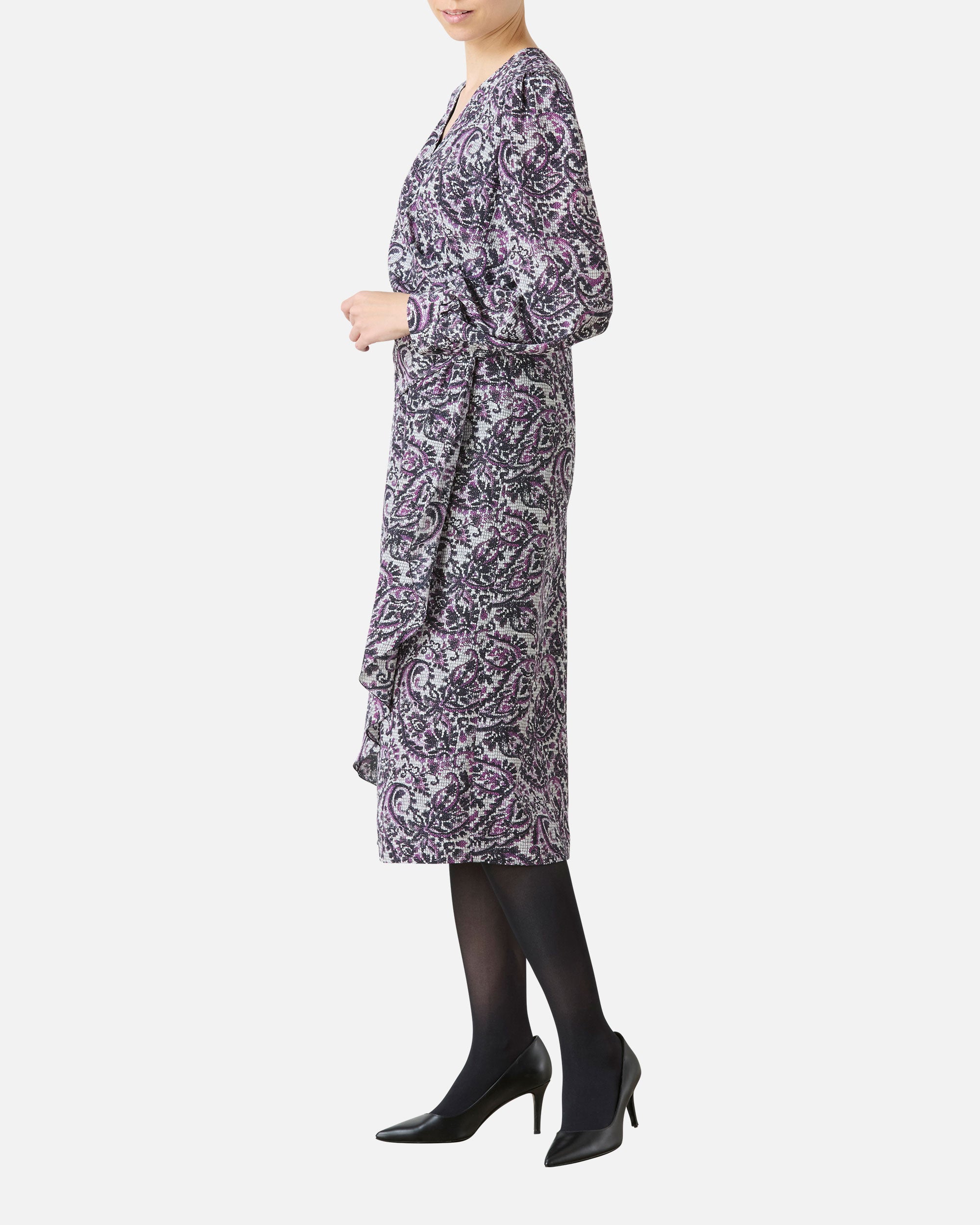 イタリア製シルクデシンに流れるようなペイズリー柄を配したプリントワンピース。クラシカルなモチーフをモダンにアレンジし、動きに合わせてニュアンスを生むドレープ使いが華やぎを添えて。日常のお出かけからちょっとしたカクテルまでどんなシーンにも着映えする、大人の気品と洗練された個性が印象的な一着です。